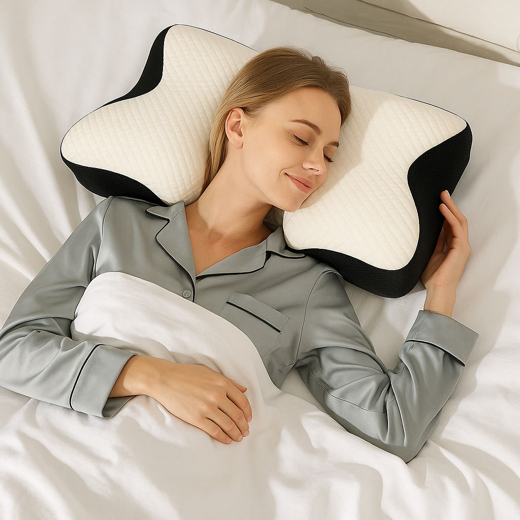 Our SnuzTech Butterfly Pillow is designed with a contoured butterfly shape that gently cradles your neck and supports your head. This innovative design promotes proper spinal alignment, relieves pressure points, and helps reduce neck and shoulder discomfort — so you can fall asleep faster and wake up feeling truly refreshed.
