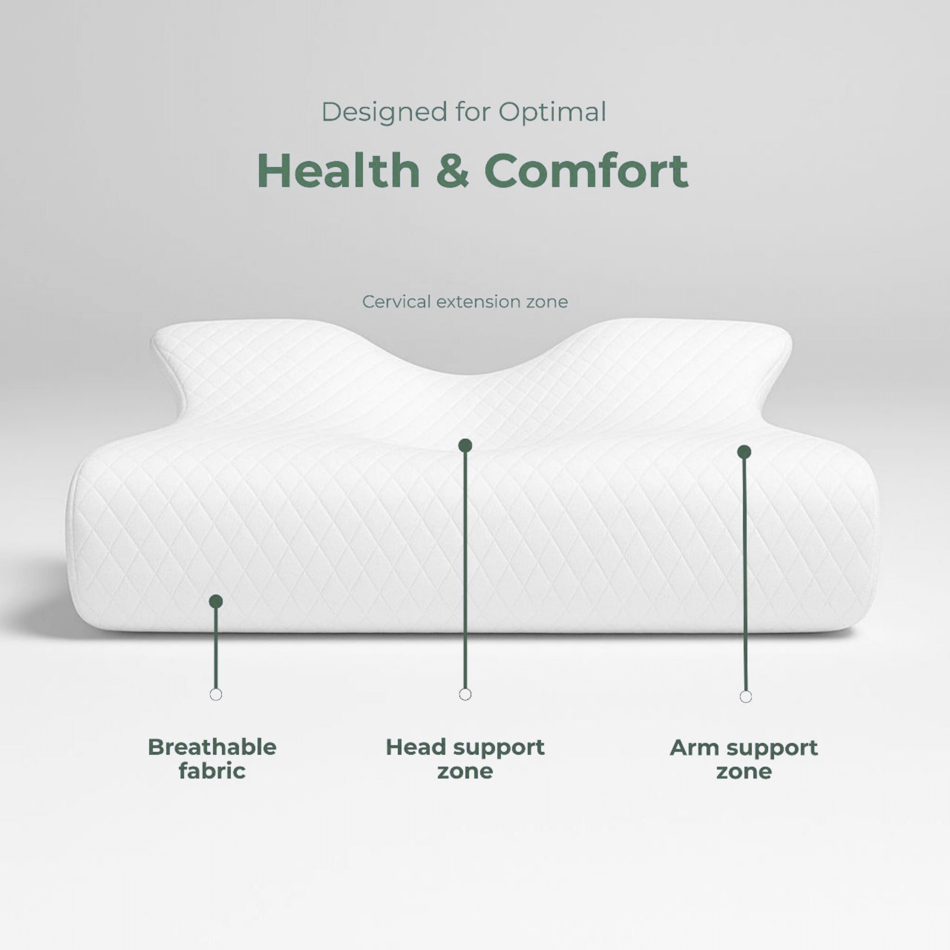 Our SnuzTech Butterfly Pillow is designed with a contoured butterfly shape that gently cradles your neck and supports your head. This innovative design promotes proper spinal alignment, relieves pressure points, and helps reduce neck and shoulder discomfort — so you can fall asleep faster and wake up feeling truly refreshed.